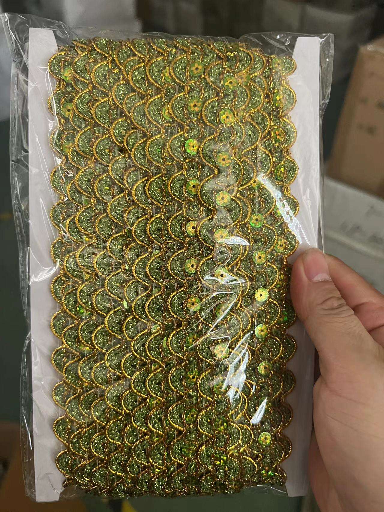 ஆடை பாகங்கள் தங்கம் மற்றும் வெள்ளி உலோக எல்லை சரிகை டிரிம் உலோக தங்க சீக்வின்கள் எம்பிராய்டரி டாட்டிங் சரிகை டிரிம் மெட்டல் சீக்வின் எம்பிராய்டரி நுட்பத்தை ஏற்றுக்கொண்டு வெற்று-அவுட் சரிகை வடிவமைப்போடு இணைகிறது, இது ஆடை துணை அலங்காரத்திற்கு ஏற்றது.